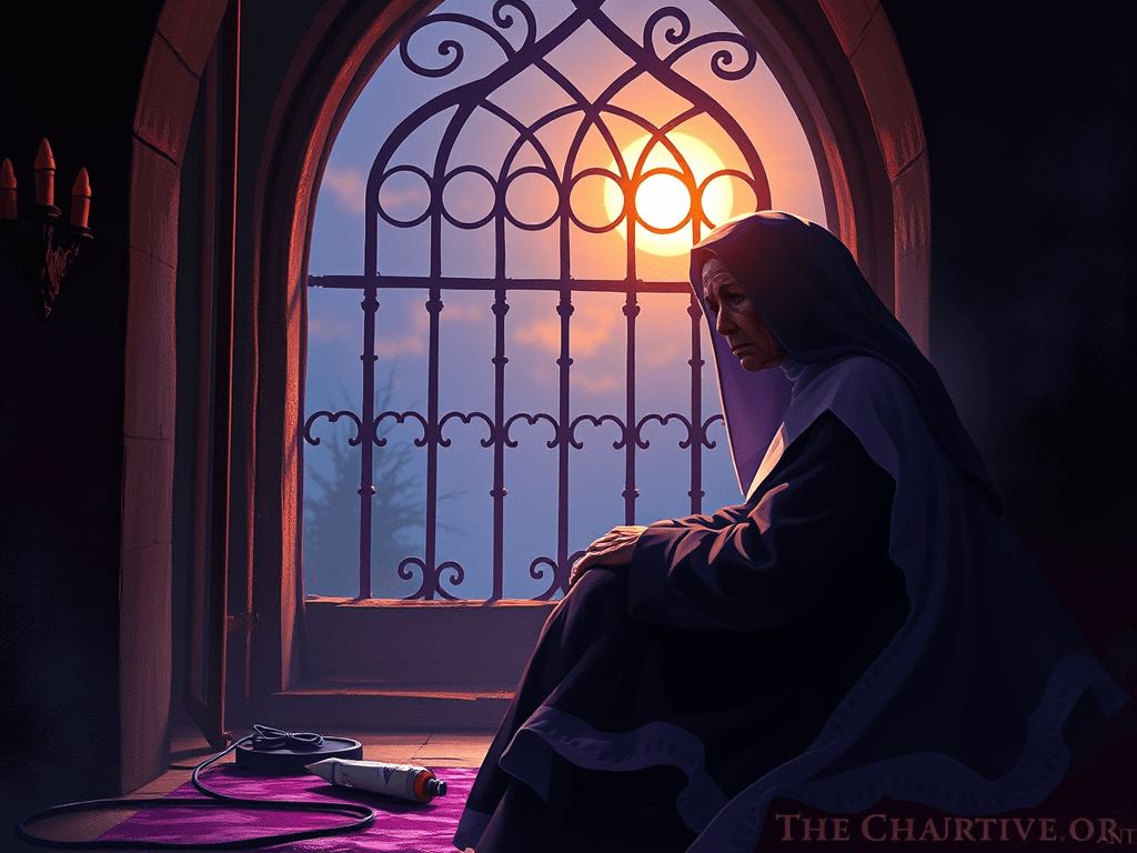 Sister Agnes, stooped and frail, watches from the cloister’s arch,