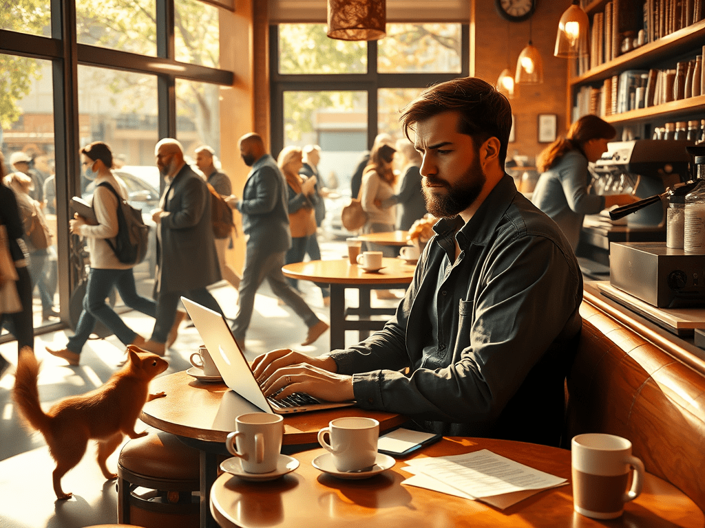 The poet sits within the Barista’s din,